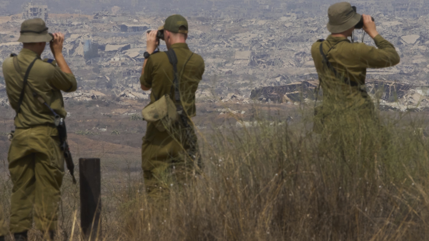 Israeli soldiers use binoculars to look at damaged buildings in the Gaza Strip from southern Israel on Wednesday, Aug. 13.