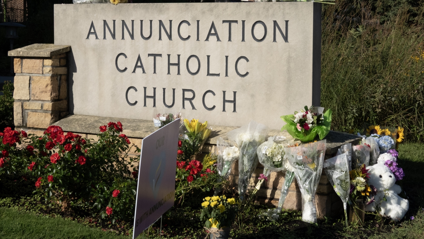 A memorial to shooting victims sits in front of Annunciation Catholic Church in Minneapolis on Aug. 28. A shooter fired through the windows of the church while students were sitting in pews during a Catholic school Mass. The assailant died at the scene from a self-inflicted gunshot wound, according to police.