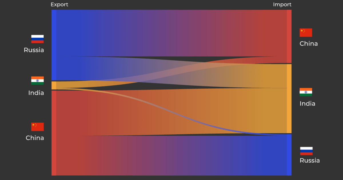 Trilateral trade between China, India and Russia accounted for $452bn in 2023, up from $351bn in 2022, according to the Observatory of Economic Complexity (OEC).