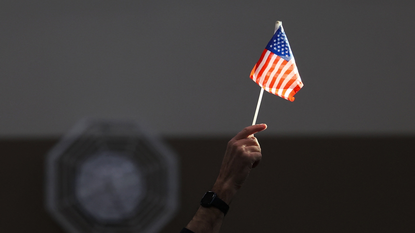 An election worker raises a U.S. flag while assisting voters at a polling station in Las Vegas on Election Day, Nov. 5, 2024.