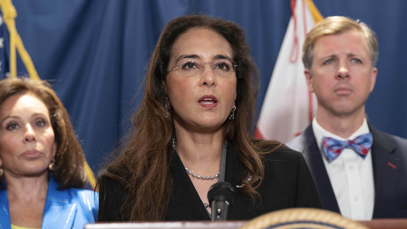 Harmeet Dhillon, head of the Justice Department’s Civil Rights Division, speaks during a news conference on Aug. 7.