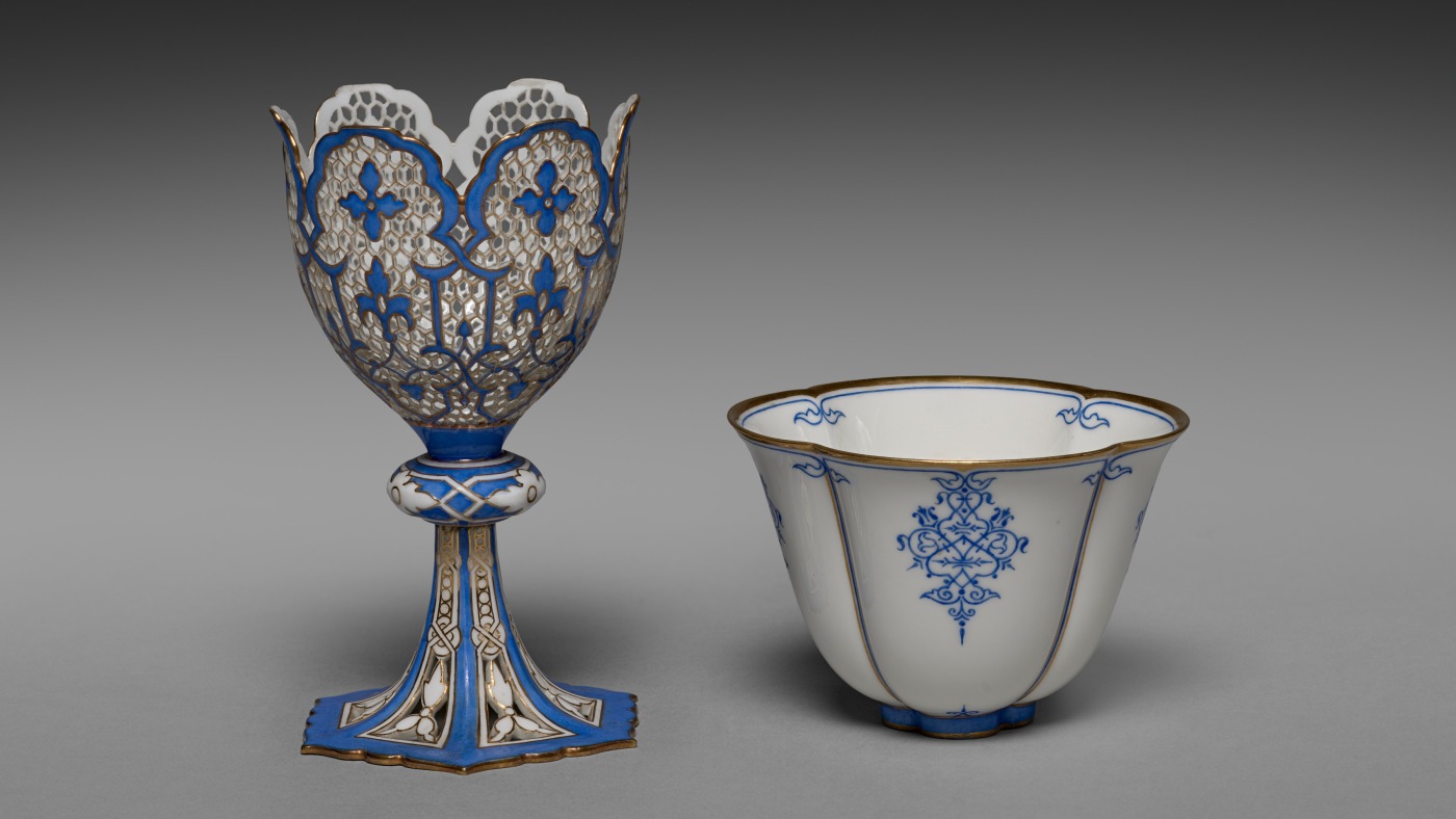 A French zarf and cup, made around 1848 to 1855, made of porcelain. Zarfs are often associated with coffee drinking in the Ottoman Empire, but many were made in Europe.