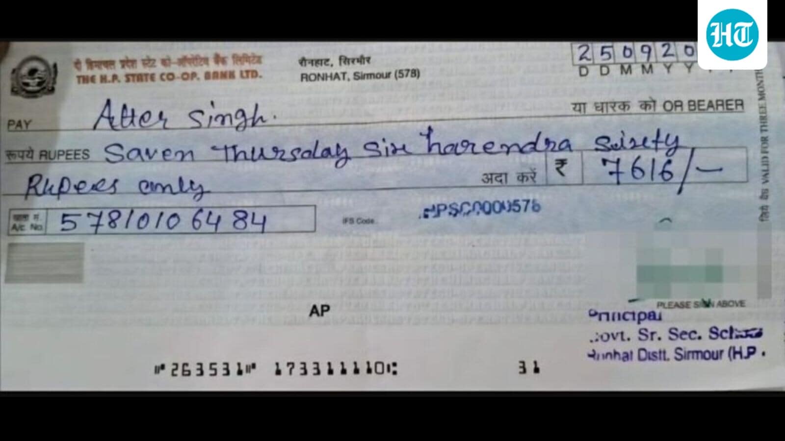 The principal of Government Senior Secondary School, Ronhat, Himachal Pradesh allegedly failed to write the amount in words correctly, spelling ‘seven’ as ‘saven’, ‘thousand’ as ‘Thursday’ and ‘hundred’ as ‘harendra’. He further wrote ‘sixteen’ as ‘sixty’ at the end.